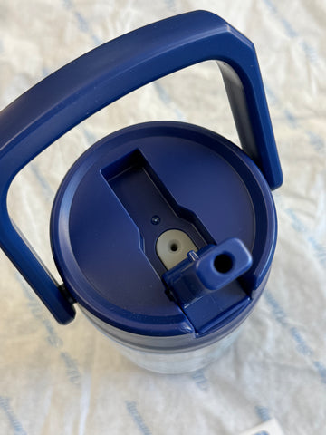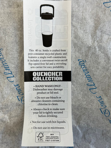 40 oz. clear AS plastic body with molded base and matching lid with flip-up straw and carrying handle.Made using 38% post-consumer recycled plastic.